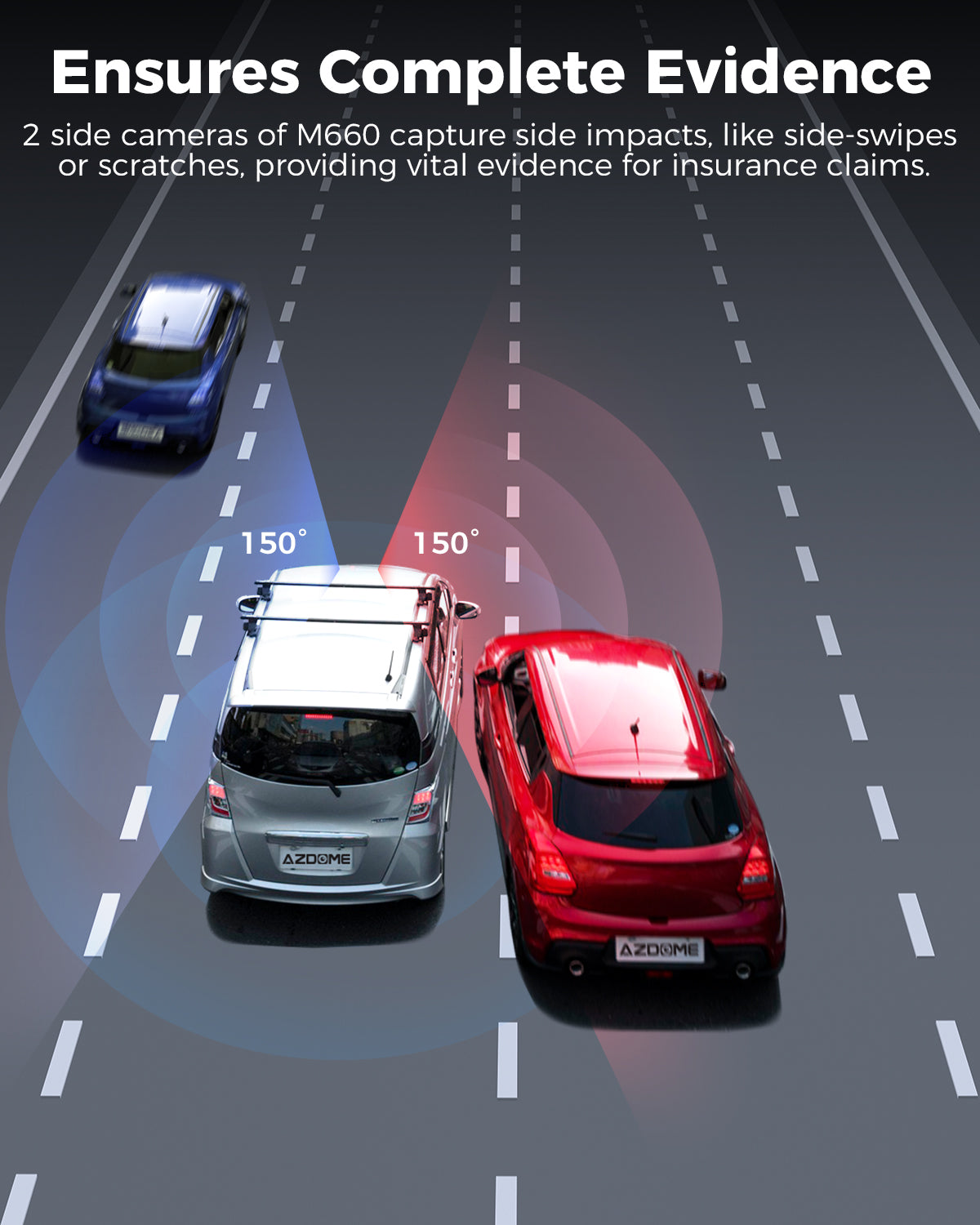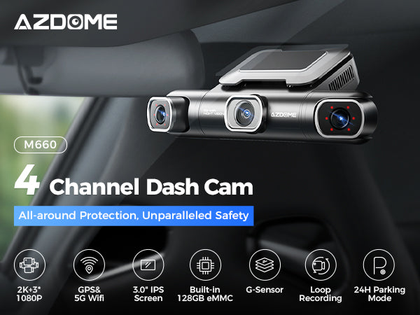 الوحدة الرئيسية تضم الكاميرا الأمامية وأدوات التحكم، بينما توضع الكاميرات الخلفية والجانبية لتوفير رؤية كاملة 360°. يمكن عرض التسجيلات على شاشة بحجم 3 بوصات أو عبر تطبيق AZDOME على الهاتف باستخدام Wi-Fi، كما يمكن عرض بيانات GPS عبر التطبيق أو برنامج تشغيل AZDOME على الكمبيوتر.