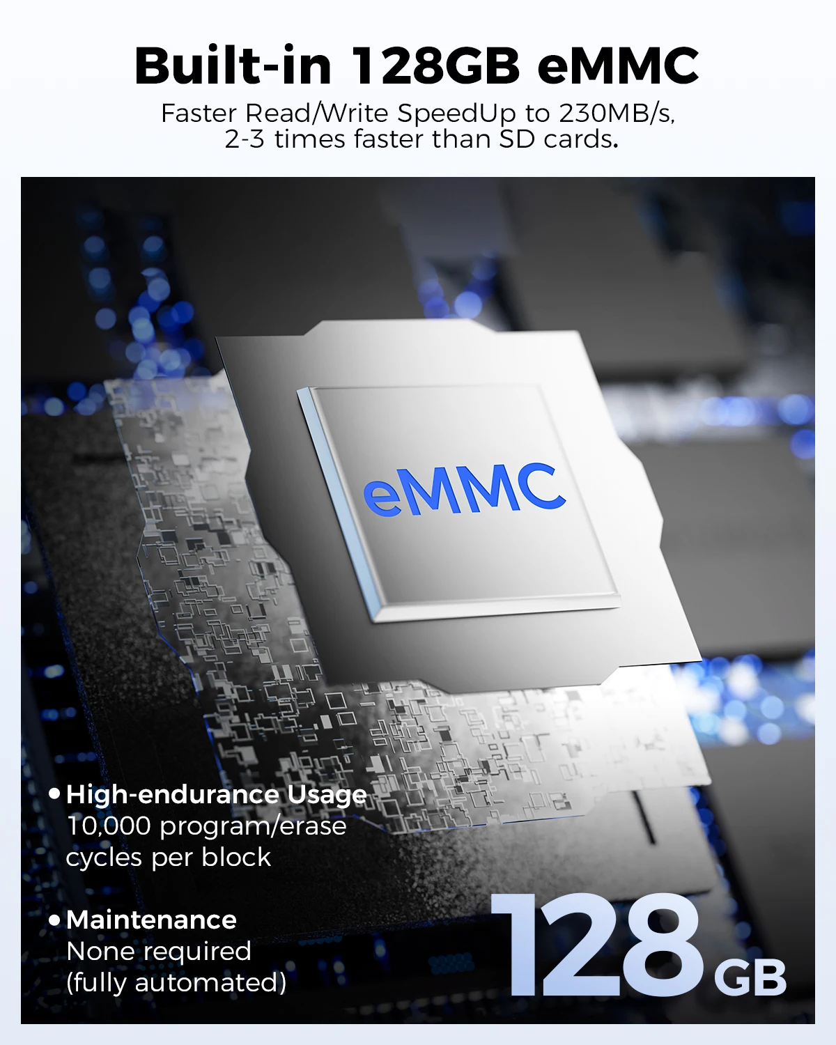 التخزين: تأتي بذاكرة eMMC مدمجة سريعة بسعة 128GB، أسرع من بطاقات SD التقليدية، ولا حاجة لبطاقات خارجية.