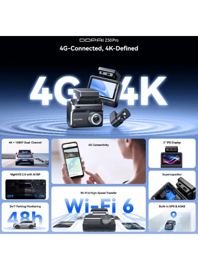 كاميرا DDPAI Z50 Pro ثنائية القناة تُعد واحدة من أقوى أنظمة تسجيل القيادة بفضل دمجها بين دقة 4K Ultra HD في الكاميرا الأمامية ودقة 1080P Full HD في الخلفية، مما يمنحك تغطية واضحة وشاملة لجميع تفاصيل الطريق من كل الاتجاهات. تم تصميمها لتوفير حماية كاملة لسيارتك أثناء القيادة أو حتى أثناء اصطفافها، مع تقنيات متطورة ترفع مستوى الأمان والراحة للسائقين.