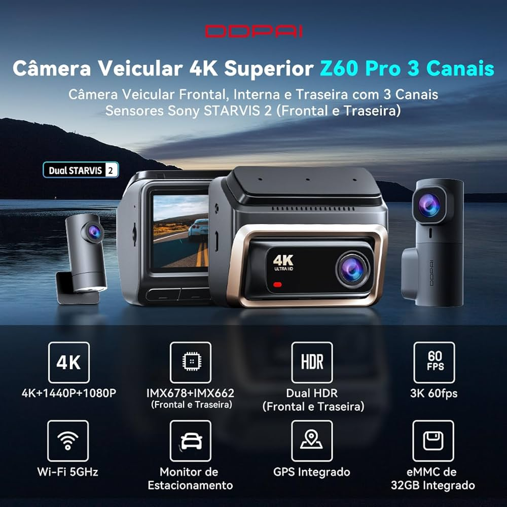 كاميرا DDPAI Z60 Pro ثلاثية القناة هي نظام أمني متكامل للسيارة يوفر تغطية شاملة ثلاثية الزوايا مع تسجيل أمامي بدقة 4K، داخلي بدقة 2K، وخلفي بدقة 1080P. تستخدم الكاميرا مستشعرات Sony STARVIS 2 IMX678 للأمام وIMX662 للخلف مع دعم تقنية HDR لتقديم وضوح استثنائي وتفاصيل دقيقة في مختلف ظروف الإضاءة.